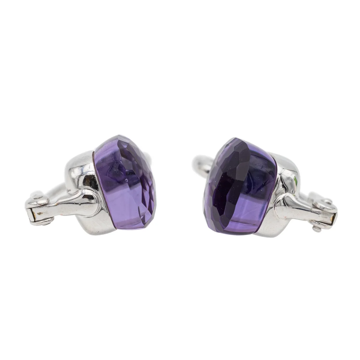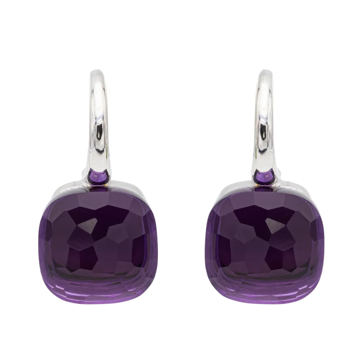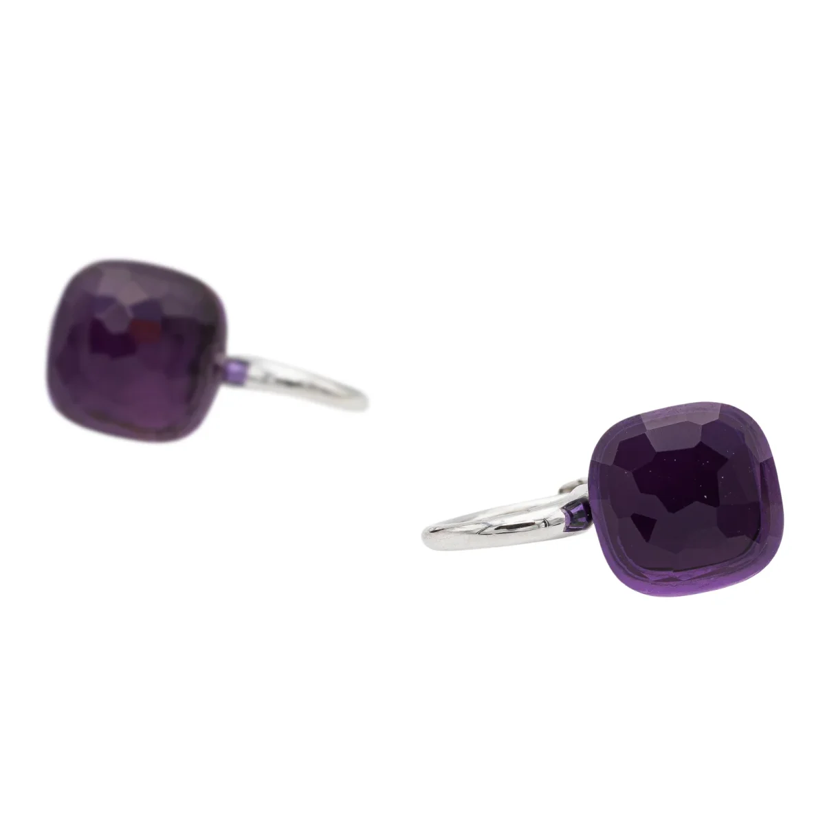 Boucles d’oreilles signées de la maison Pomellato, collection Nudo Classic, en or blanc 750 millièmes (18 carats), serties de deux améthystes, taille carrée facetée, d’environ 3,60 cts chacune, poids total améthystes: environ 7,20 carats, dimensions: 2 cm x 1,04 cm, poids total: 9,21 g, poinçon tête d’aigle, prix neuf: 4500€, excellent état