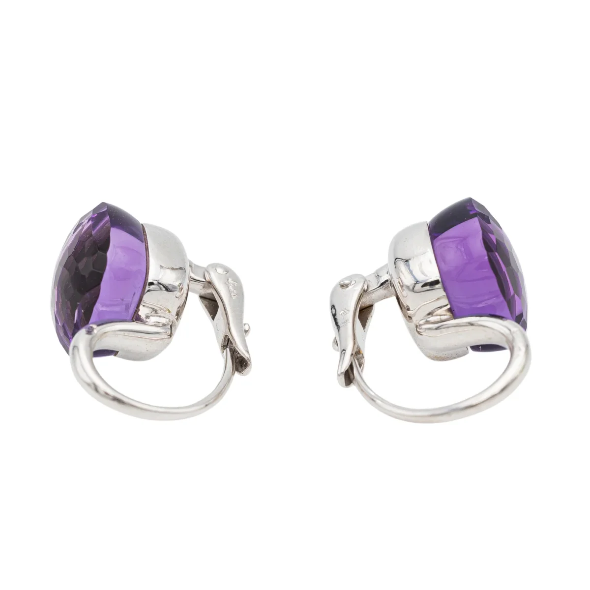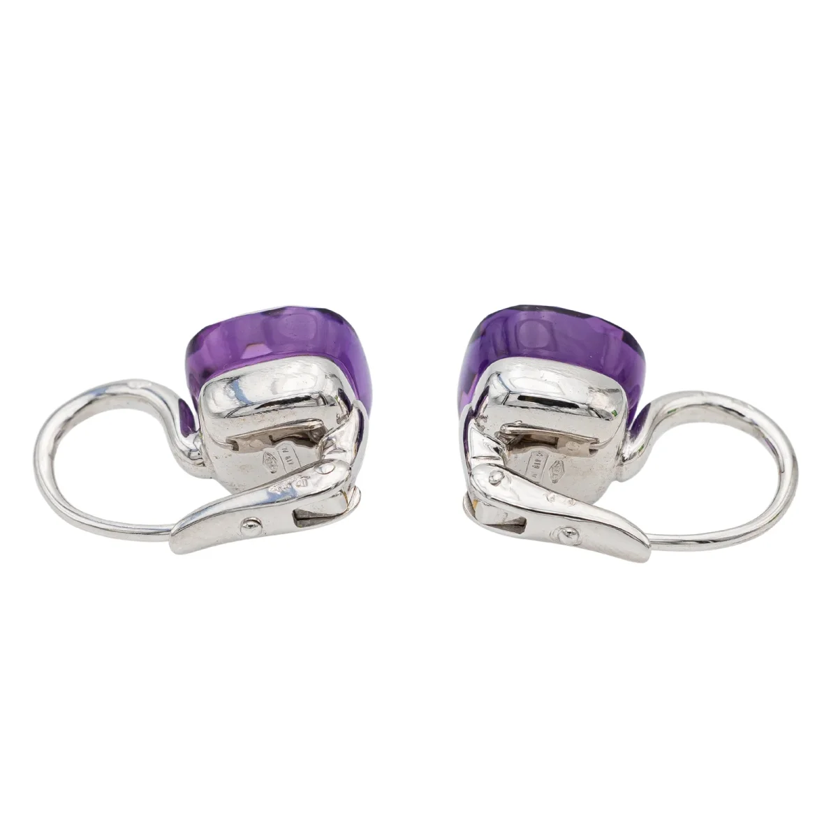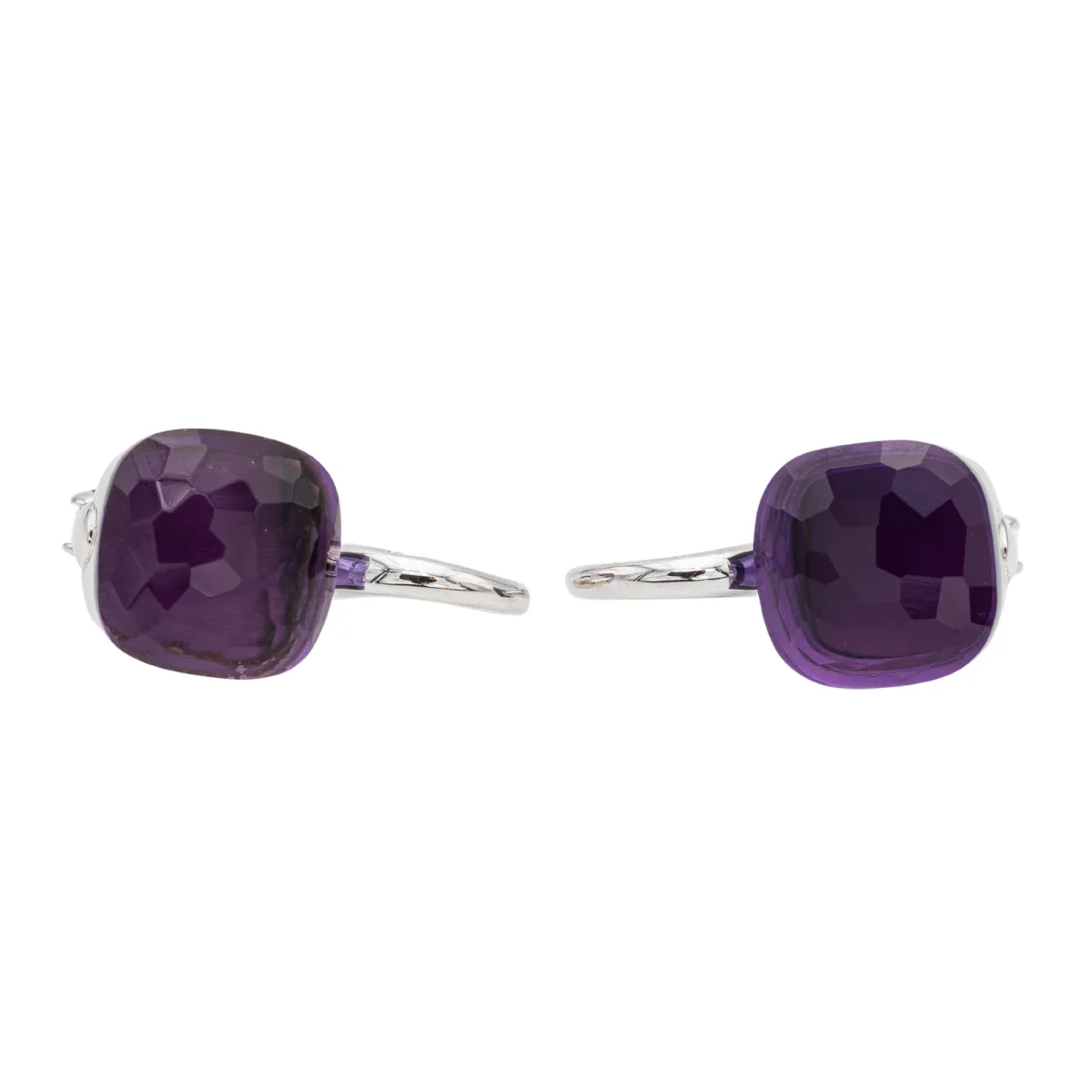 Boucles d’oreilles signées de la maison Pomellato, collection Nudo Classic, en or blanc 750 millièmes (18 carats), serties de deux améthystes, taille carrée facetée, d’environ 3,60 cts chacune, poids total améthystes: environ 7,20 carats, dimensions: 2 cm x 1,04 cm, poids total: 9,21 g, poinçon tête d’aigle, prix neuf: 4500€, excellent état