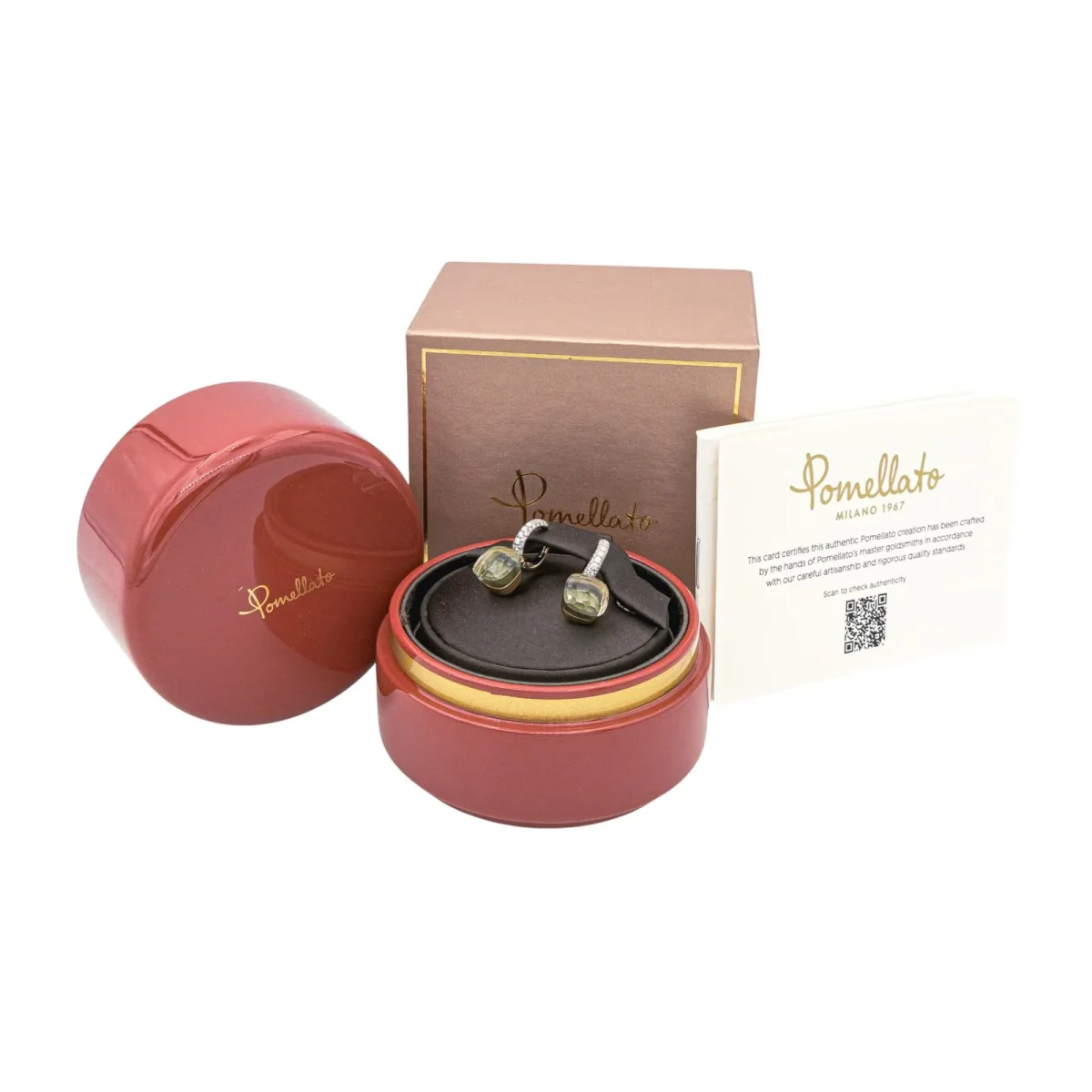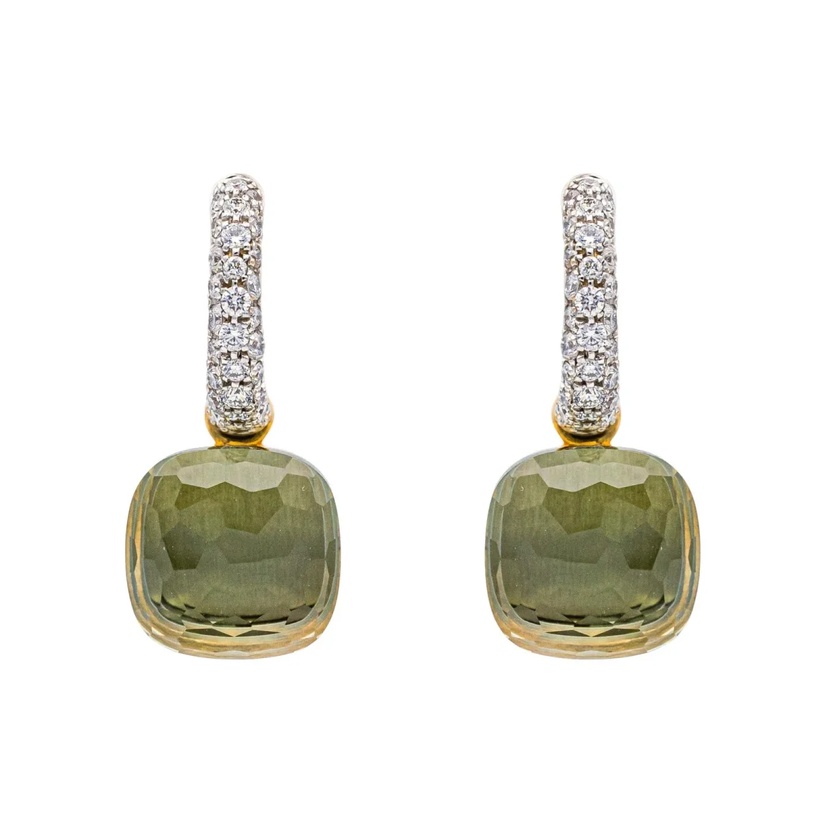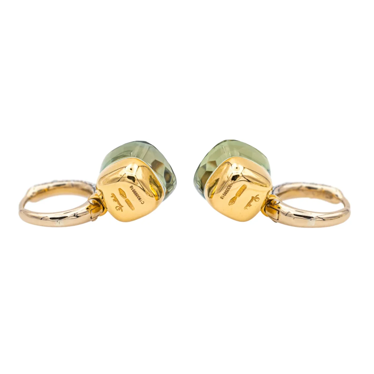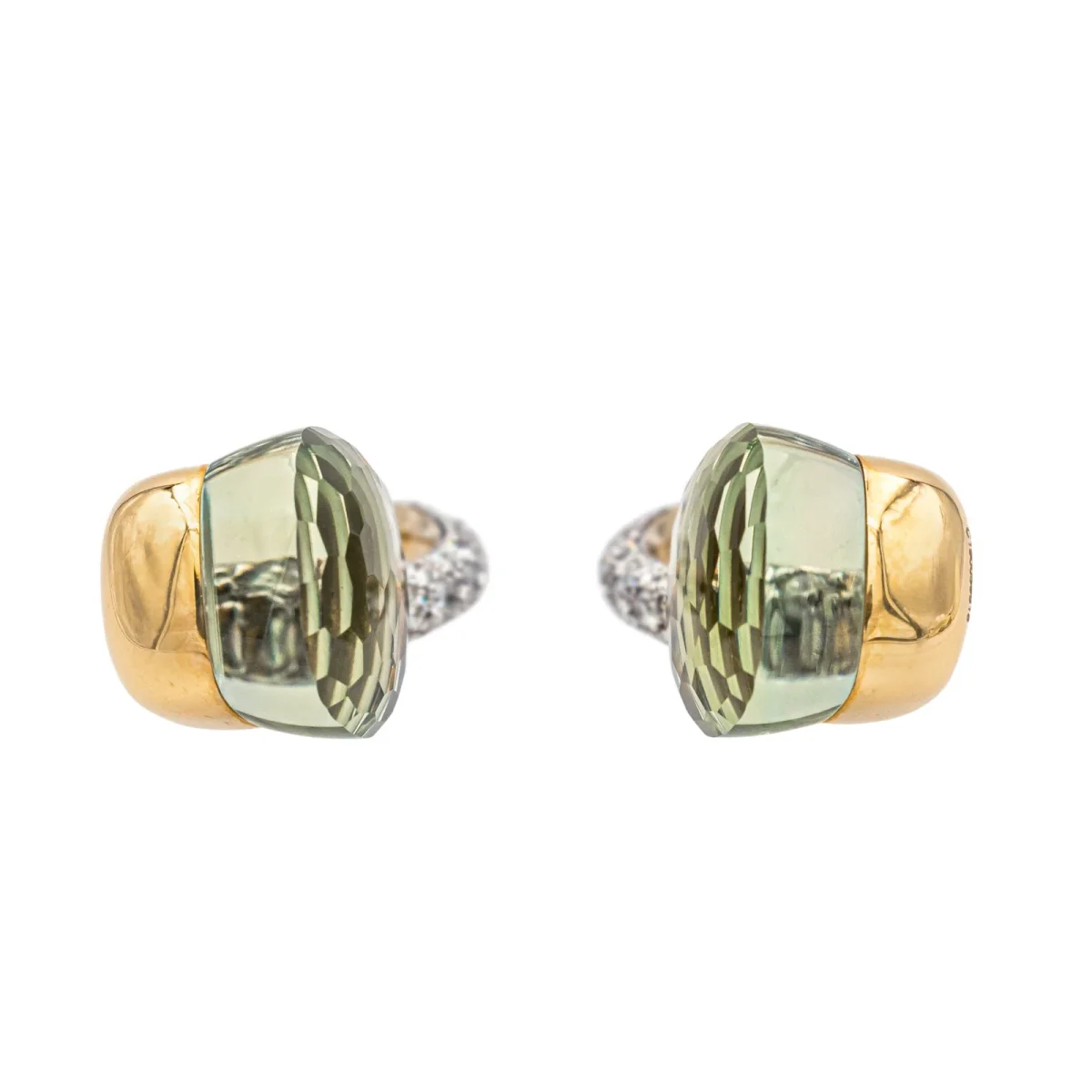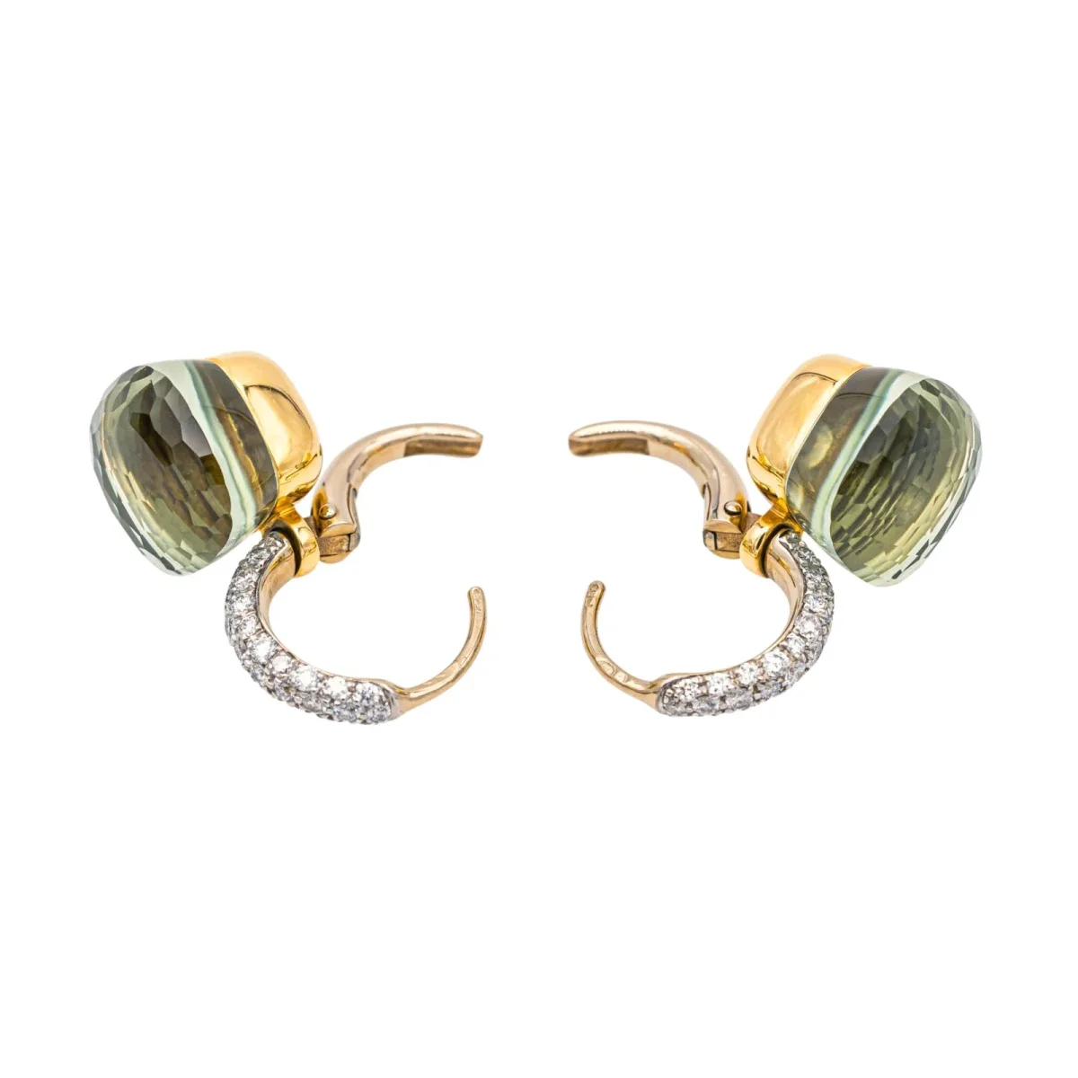 Boucles d’oreilles signées de la Maison Pomellato, collection Nudo, en or rose et blanc 750 millièmes (18 carats), serties de deux prasiolites d’environ 7 cts chacune, et pavée de 56 diamants taille brillant, environ G/VS pour un total d’environ 0,50 ct, Poids total prasiolite: environ 14 cts, dimensions : 2,3 cm x 1,05 cm, poids total : 9,10 g,numérotées : C190059918, full set, excellent état, jamais portées