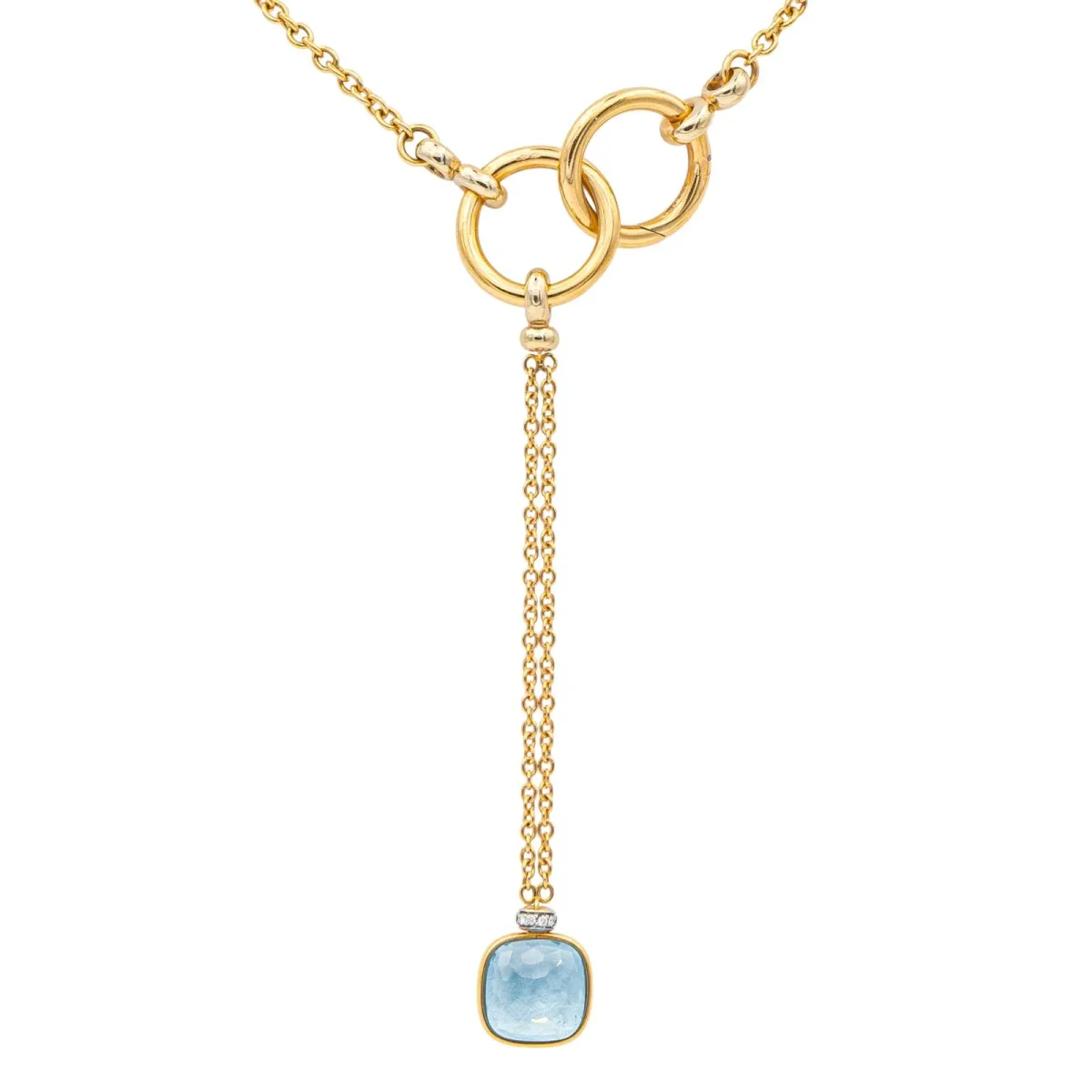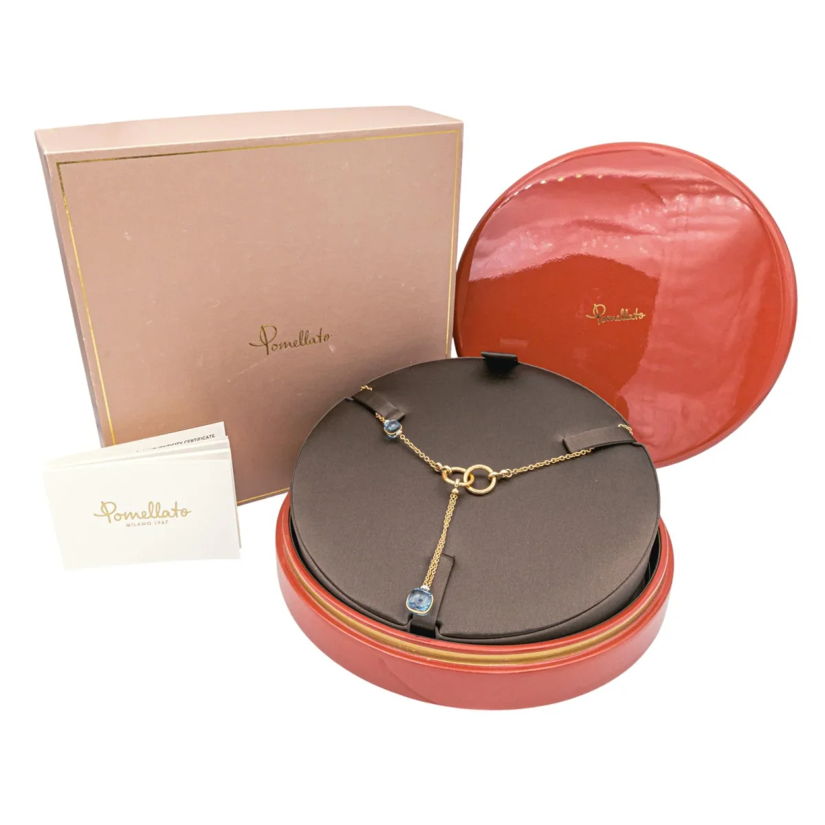 Collier négligé signé de la Maison Pomellato, collection Nudo, en rose et blanc 750 millièmes (18 carats), sertie de deux topazes bleu ciel, pour un total d’envion 20,70 cts, et pavée de 24 diamants, taille brillant environ G/VS, pour un total d’environ 0,10 ct, taille : 45 cm, longueur du pendant: 9,5 cm, poids total : 27,43 g, full set, excellent état, jamais porté