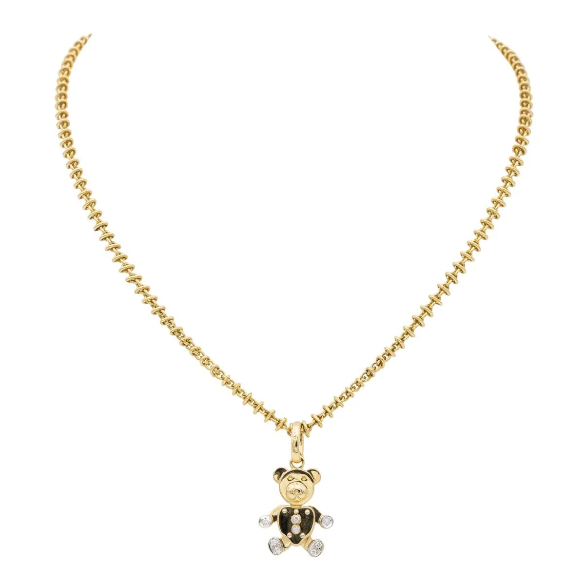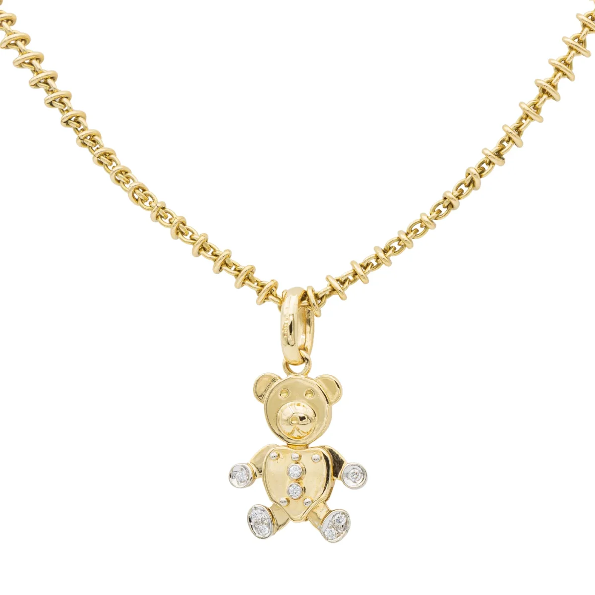 Chaine et pendentif signé de la Maison Pomelatto en or jaune et blanc 750 millièmes (18 carats), maille souple, longueur: 45,00 cm, largeur chaine: 0,43 cm, pendentif ours Orsetto serti sur or blanc de 8 diamants taille brillant, environ H-VS, d’un poids total d’environ 0,08 ct, (chaque diamant d’un poids d’environ 0,01 ct), dimensions avec la bélière: 3,30 cm x 1,77 cm, poids total: 35,63 g, poinçon tête d’aigle, excellent état