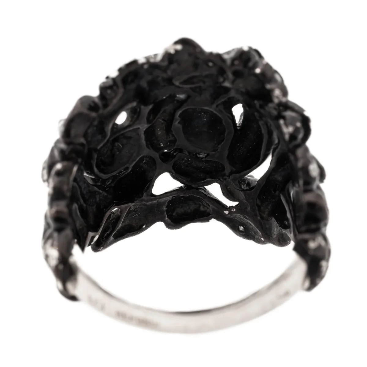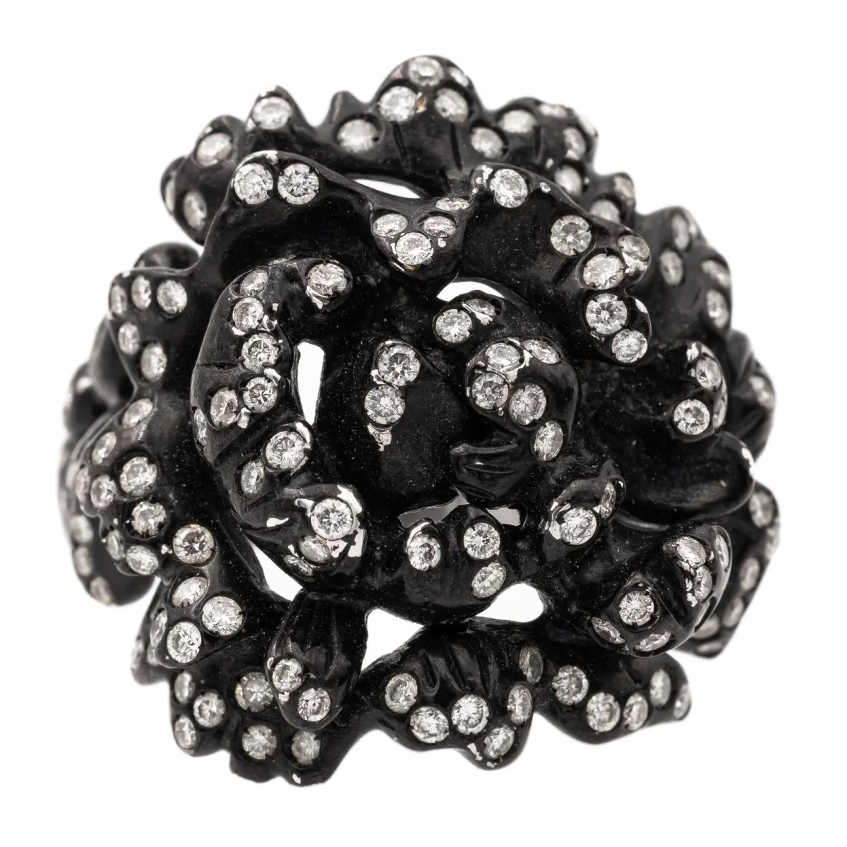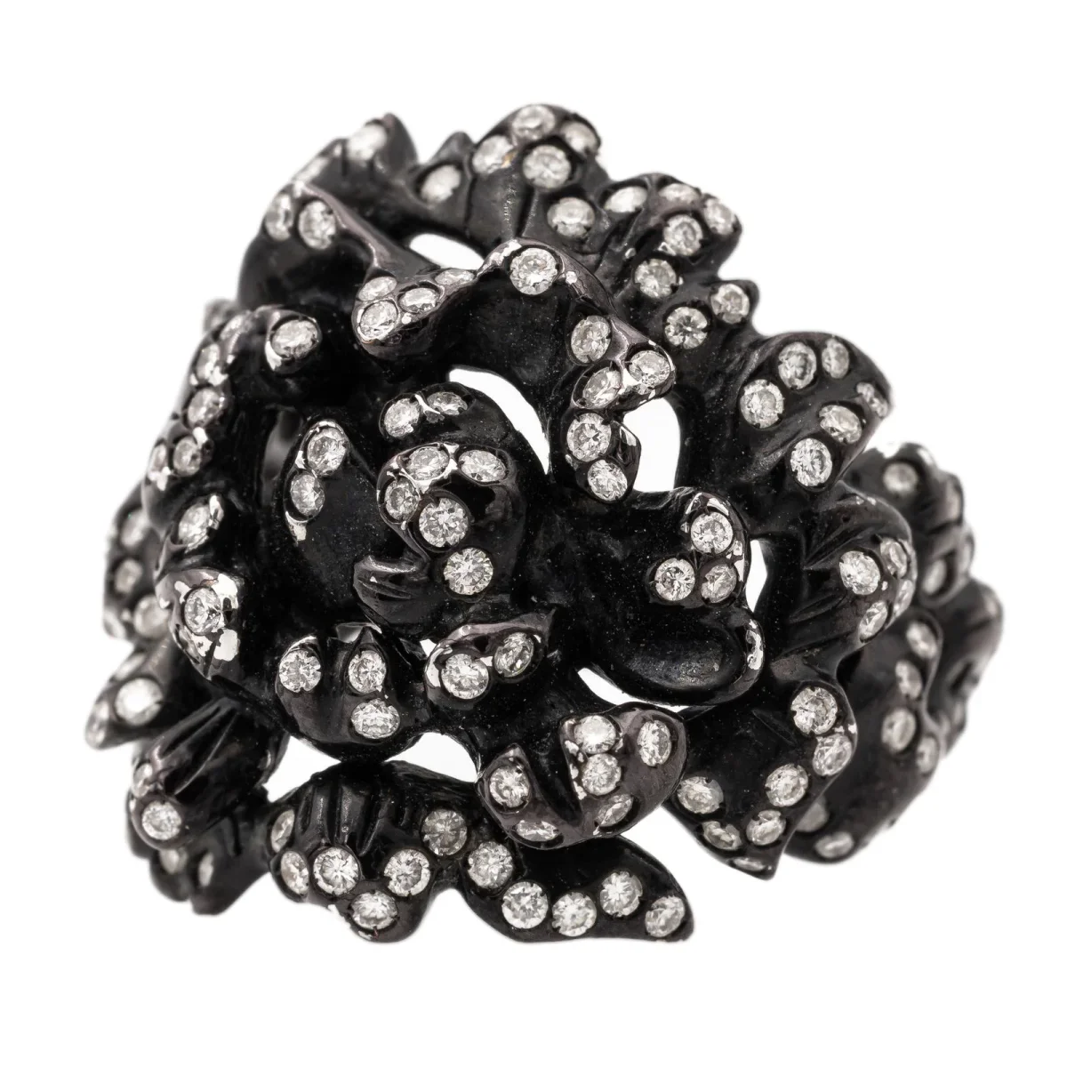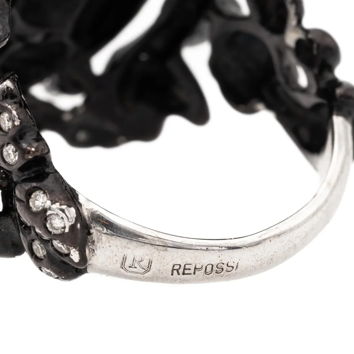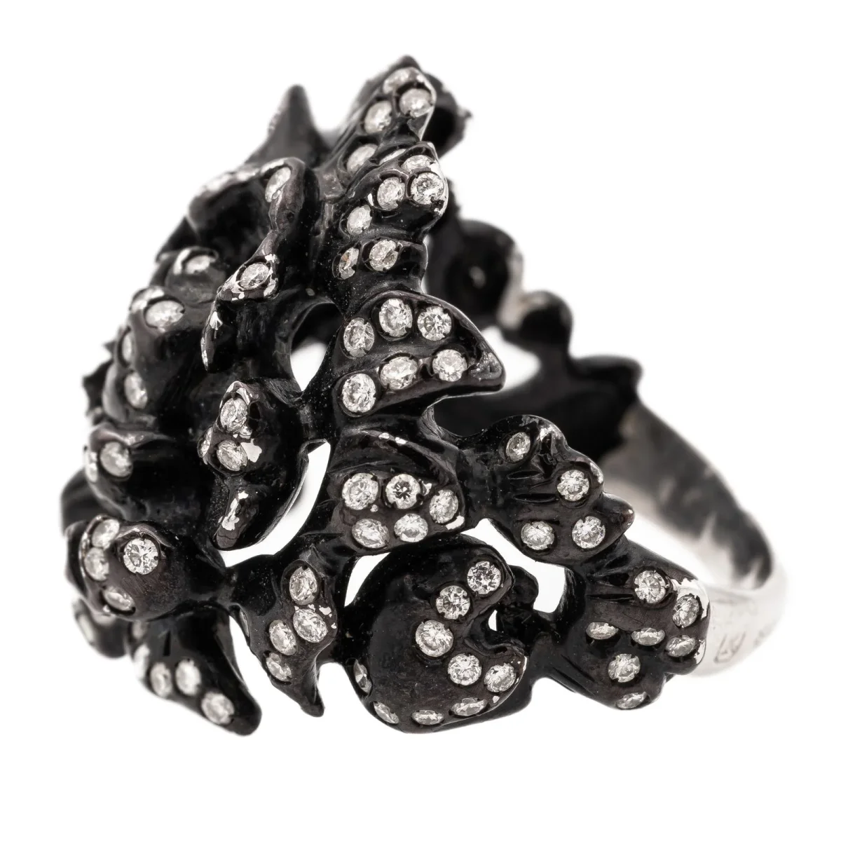 Bague signée de la Maison Repossi, Collection Nérée en Or noir 18 carats, sertie de diamants de 0,006 ct environ, pour un poids total de 0.82 carat, Couleur G-H, Pureté V-SI, taille 8/8, longueur du motif: 2,2 cm, Etat neuf, poinçonné, Taille de doigt: 51, Poids total: 10,12 g