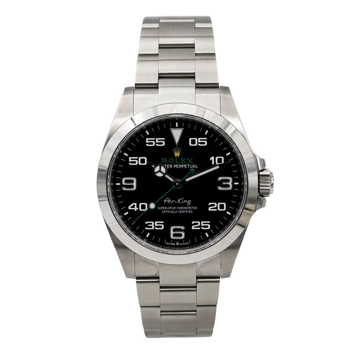Montre Rolex modèle Air king 126900 Acier, n°série Z39202W6 , cadran noir à chiffre arabe, mouvement mécanique remontage automatique, boitier 40mm, verre saphir, bracelet acier boucle déployante ( Longueur 20cm Largeur 1,64cm) poids total 144,84g, full set (ecrin d’origine et garantie), année 28/10/2023, Excellent état