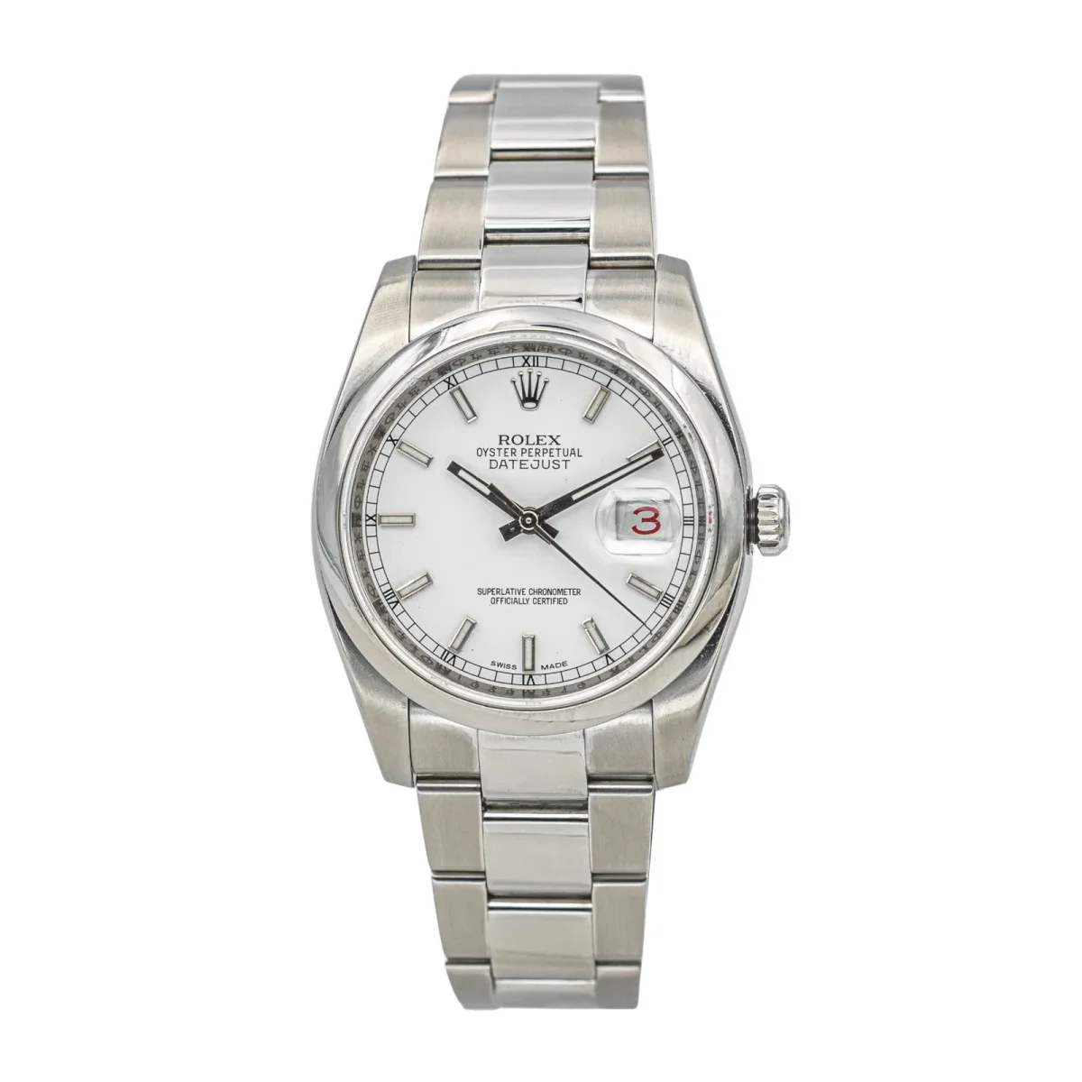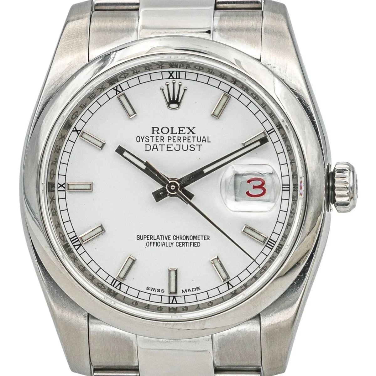 Montre signée de la Maison Rolex modèle Oyster Perpetual Datejust en acier, n° de série G786820, cadran blanc à index bâtons, mouvement mécanique à remontage automatique, boîtier 36 mm, verre saphir, bracelet an acier à boucle déployante (taille poignet 22 cm, largeur bracelet 1,90 cm), poids total : 122,32 g, fullset, année 2012, vendu avec écrin et certificat d’authenticité, révision complète et garantie 1 an, excellent état.