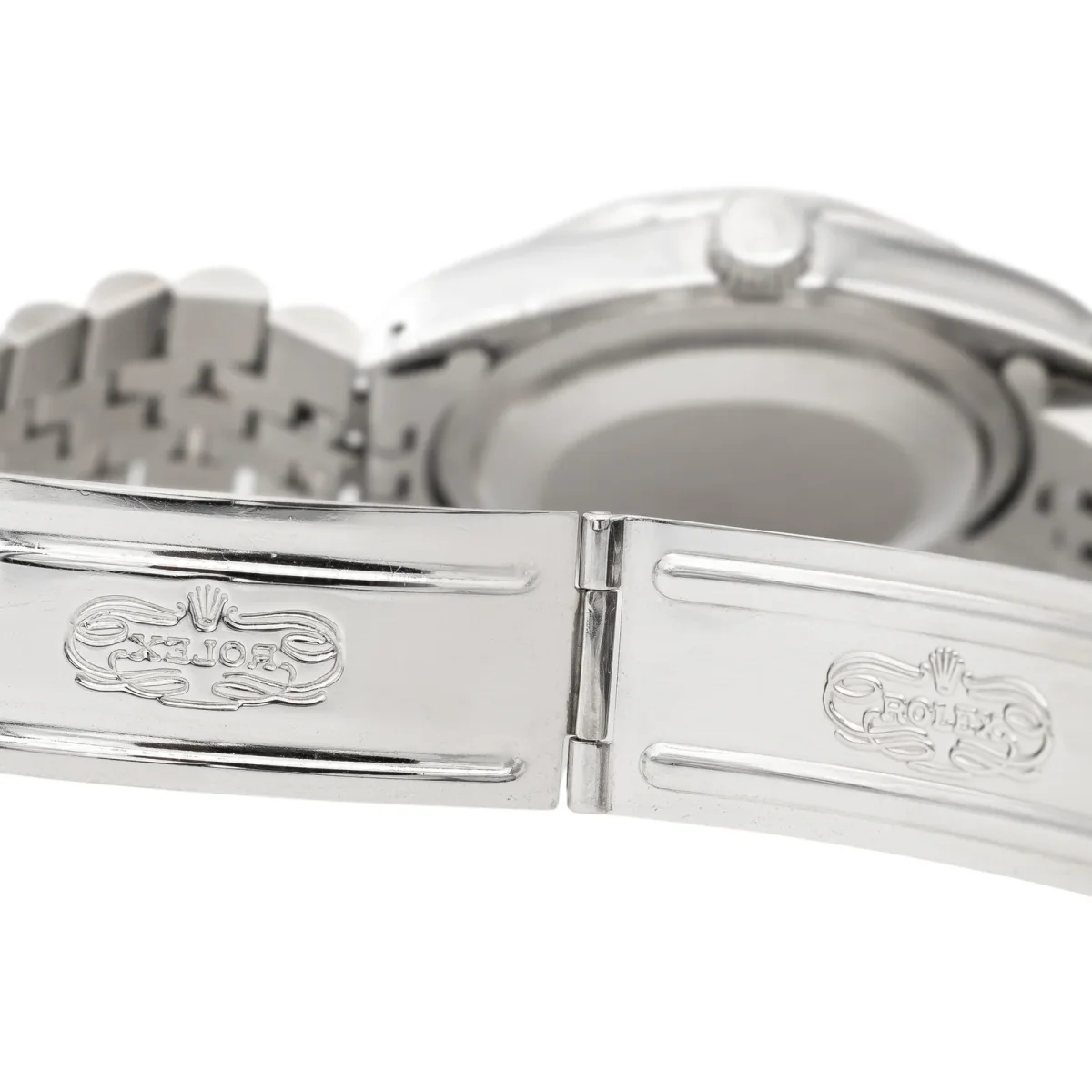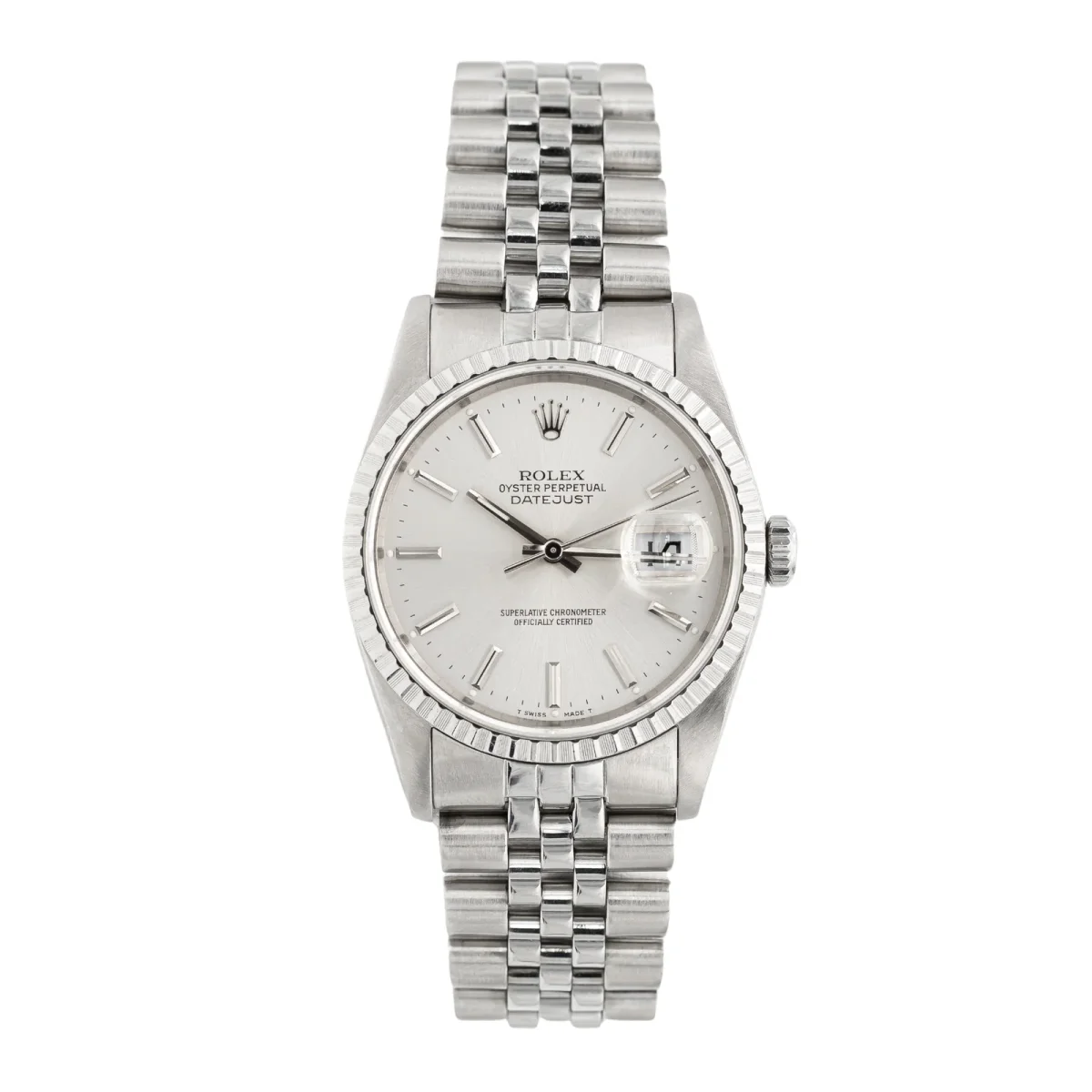 Montre homme, signée de la maison Rolex, modèle Oyster perpetural DateJust, en acier, boîtier 36 mm, mouvement mécanique à remontage automatique, bracelet jubilée, lunette cannelée, cadran silver, date à 3h, boucle déployante, index baton, taille poignet: 21 cm, largeur bracelet: 1,90 cm, poids total: 89,87 g, révisée, numérotée, livrée avec pochette Rolex et 2 maillons supplémentaires, excellent état