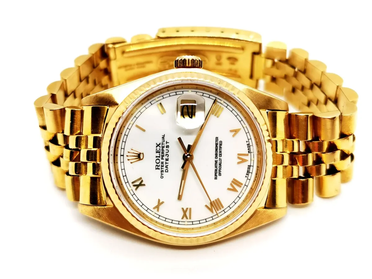 Montre homme, signée de la maison Rolex, DateJust 36, en or jaune 750 millièmes (18 carats), modèle 16018, lunette cannelée, mouvement chrono automatique, taille boîtier: 36 mm, longueur bracelet: 20,5 cm, largeur bracelet: entre 1,5 cm et 2 cm, boucle déployante, cadran blanc, chiffres romains, verre saphir, révision Rolex, poinçon tête d’aigle à demi effacé, poids total: 122,61 g, numérotée: 5536345, très bon état
