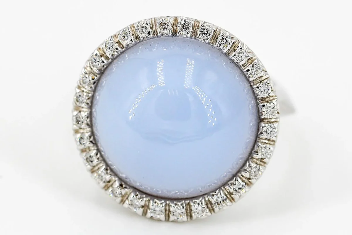 Bague signée de la Maison Susie Otero, de la collection « Mon Trésor » en or blanc 750 millièmes (18 carats), sertie d’un cabochon calcédoine de 15,99 cts, entourée de 28 diamants de 0,005 ct soit un total de 0,14 cts, couleur G-H pureté VS-SI, Taille du doigt : 53, Poids total: 10.49 g, Poinçonnée, Etat neuf