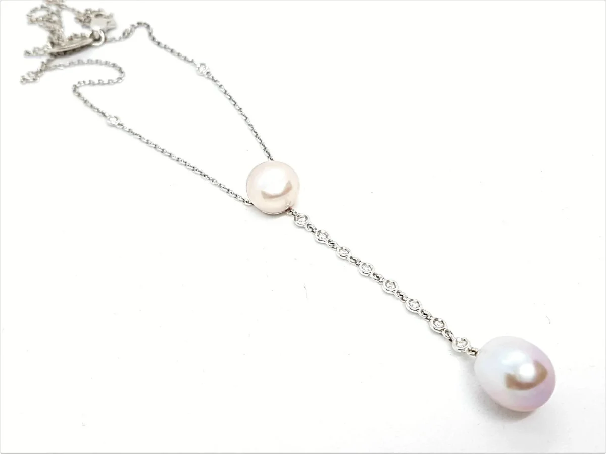 Collier signé Susie Otero, ligne « Mon trésor » Or blanc 750 millièmes (18 carats), avec Perles et diamants taille brillant G-H V-SI pour environ 0.16 ct au total, une perle de 10 mm et une perle ovale de dimension: 12 mm x 10 mm,Taille: 45 cm, Poids total: 7.55 g, poids en Or; 4.45 g, Poinçonné, état neuf, Prix boutique 3480 euros