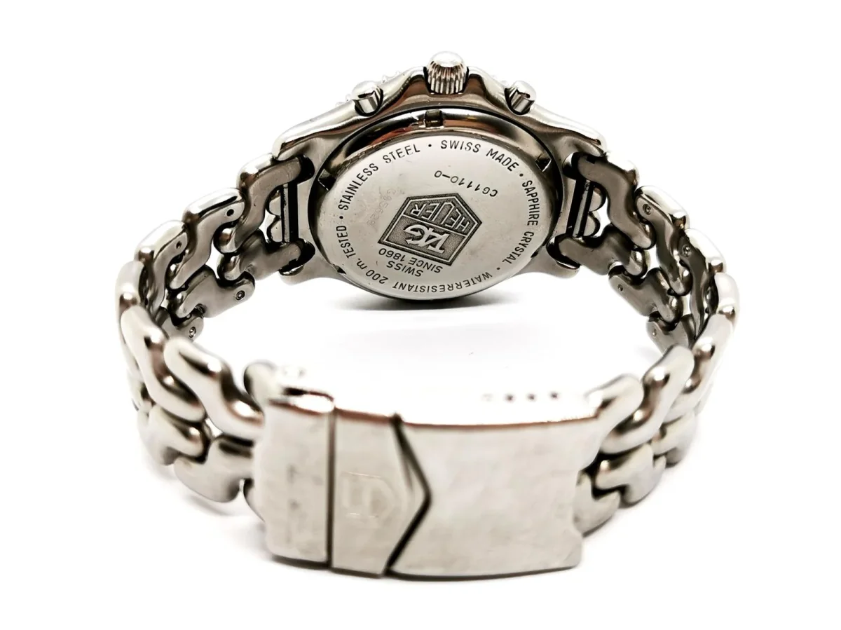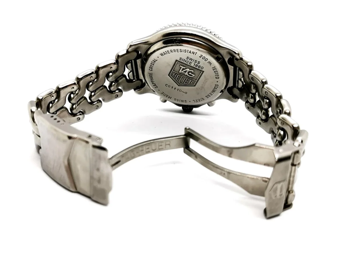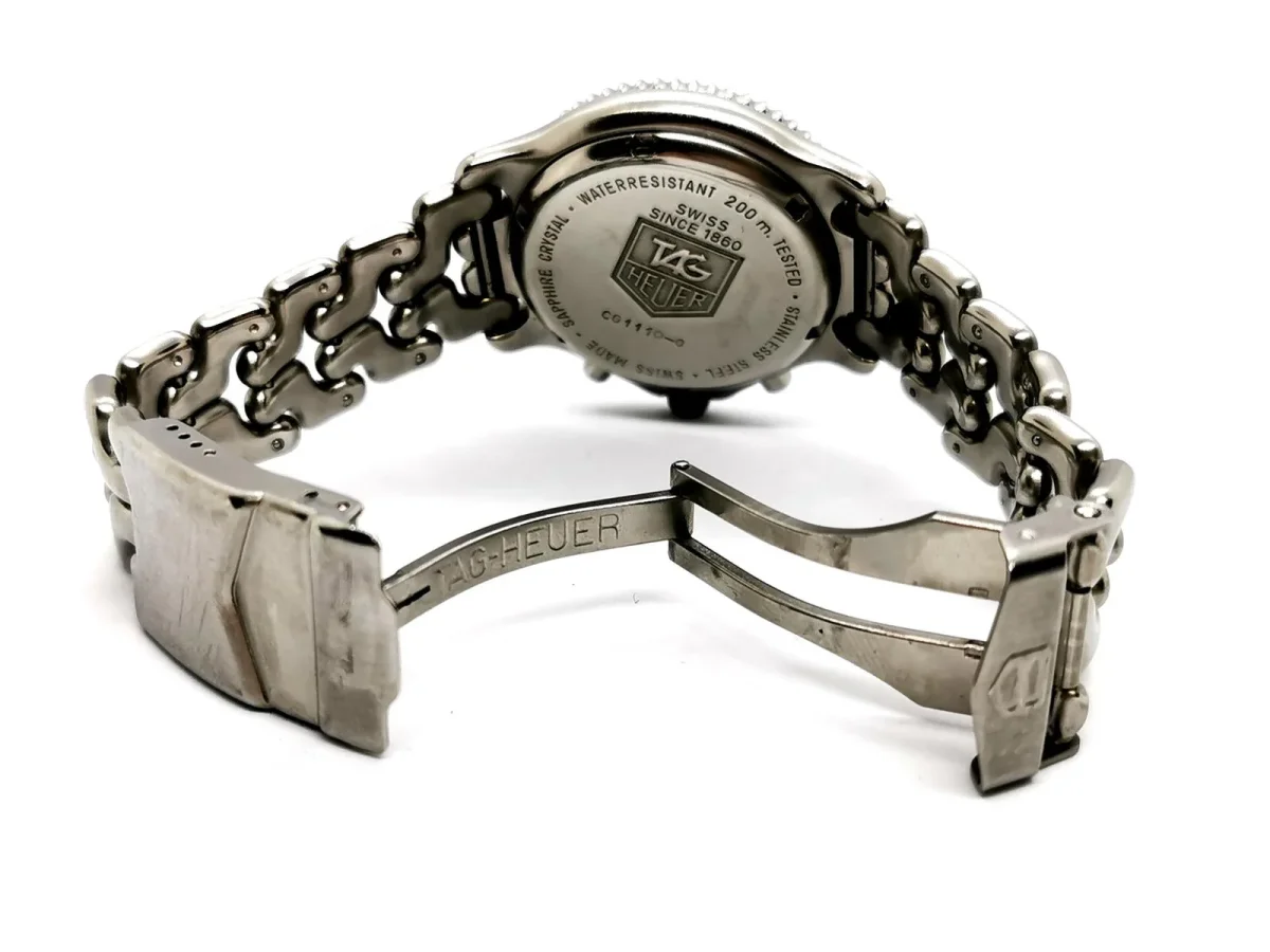 Montre homme, signée tag Heuer, modèle Sel Black Chrono, cadran noir, en acier inoxydable, affichage date, lunette tournante, boucle déployante, taille boîtier: 38 mm, poignet: 21 cm, largeur bracelet: 1,8 cm, étanche à 200 m, révisée, signée et numérotée: CG1110-0(G95628), poids total: 125,78 g, bon état