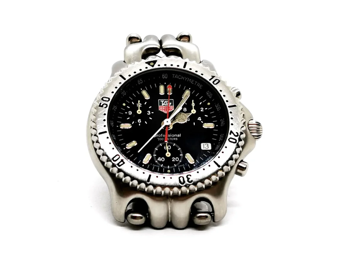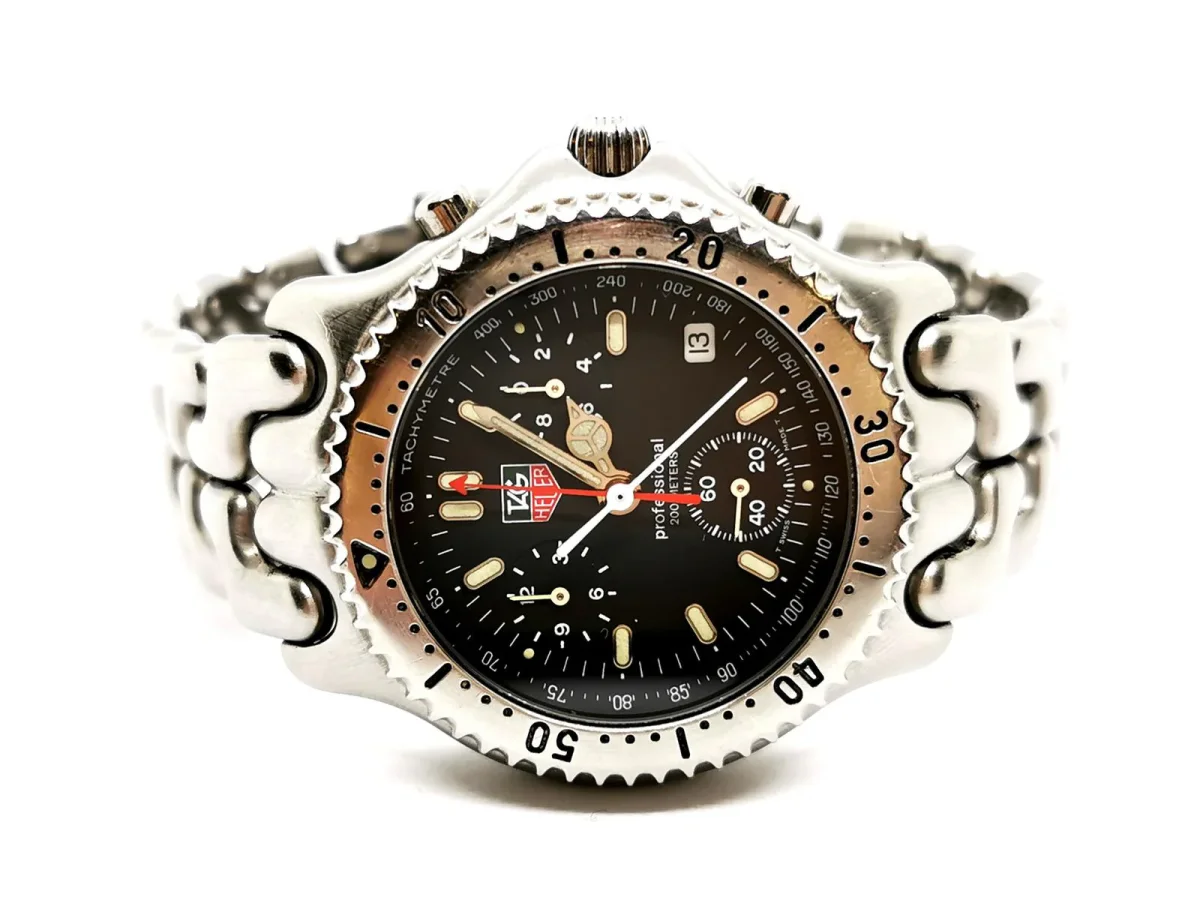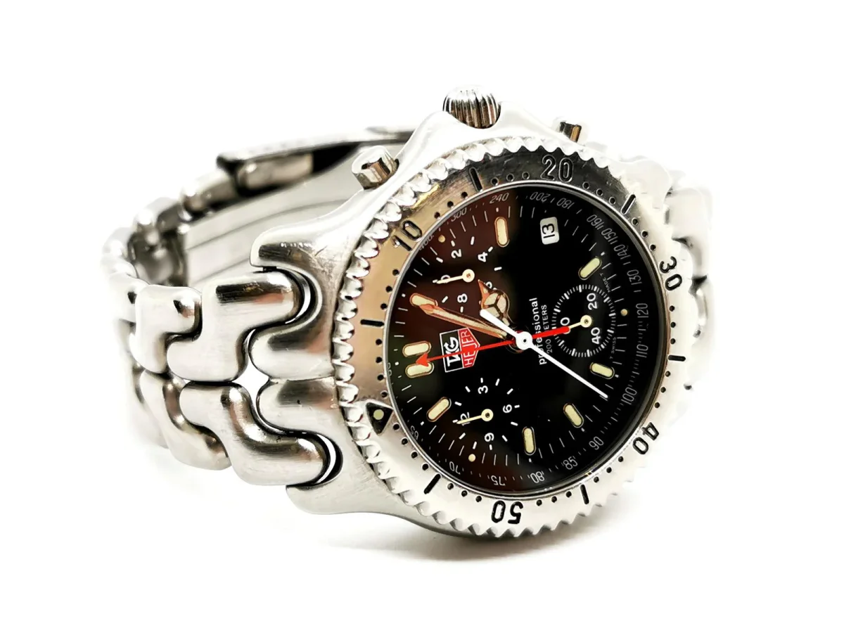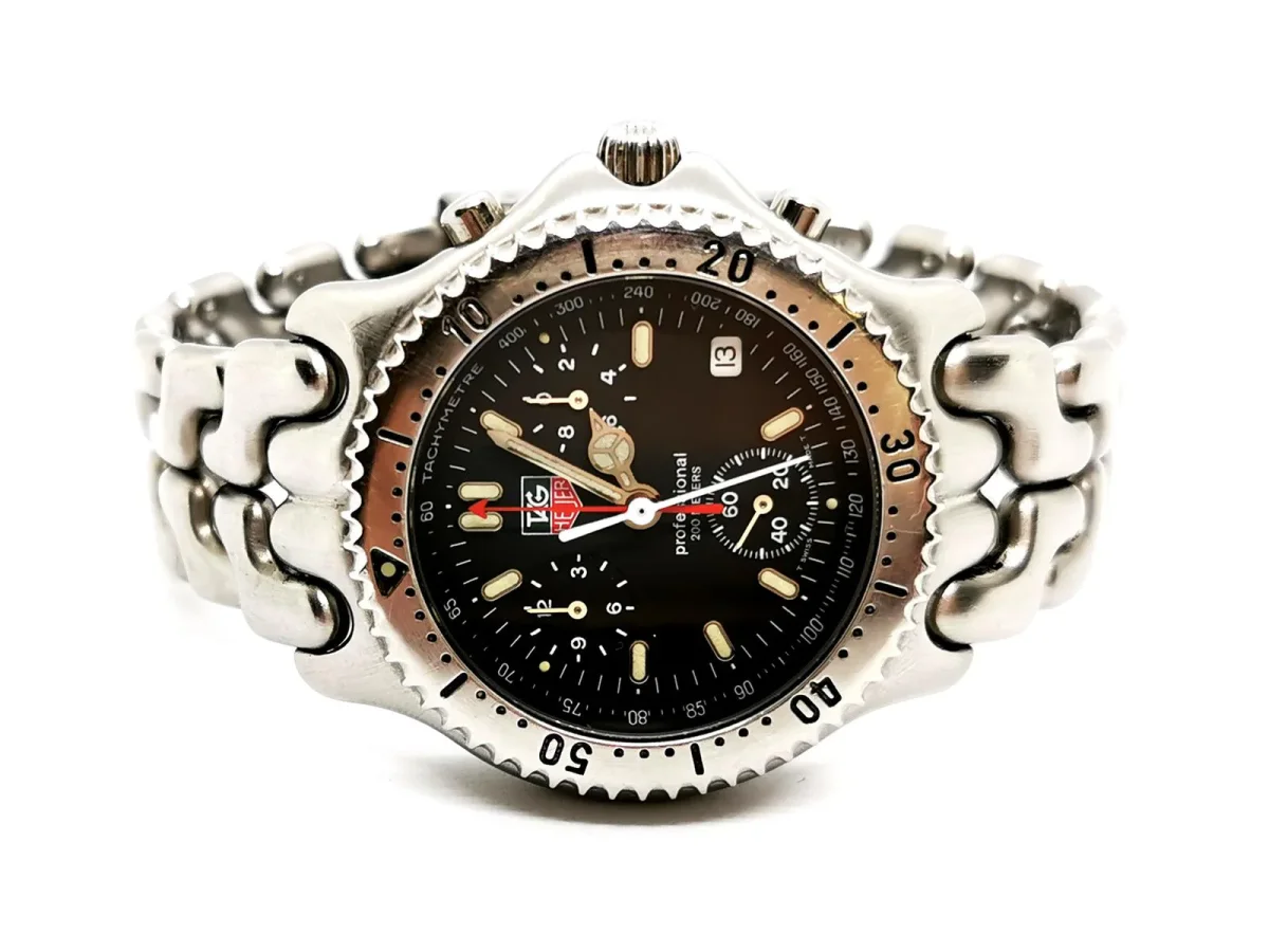 Montre homme, signée tag Heuer, modèle Sel Black Chrono, cadran noir, en acier inoxydable, affichage date, lunette tournante, boucle déployante, taille boîtier: 38 mm, poignet: 21 cm, largeur bracelet: 1,8 cm, étanche à 200 m, révisée, signée et numérotée: CG1110-0(G95628), poids total: 125,78 g, bon état