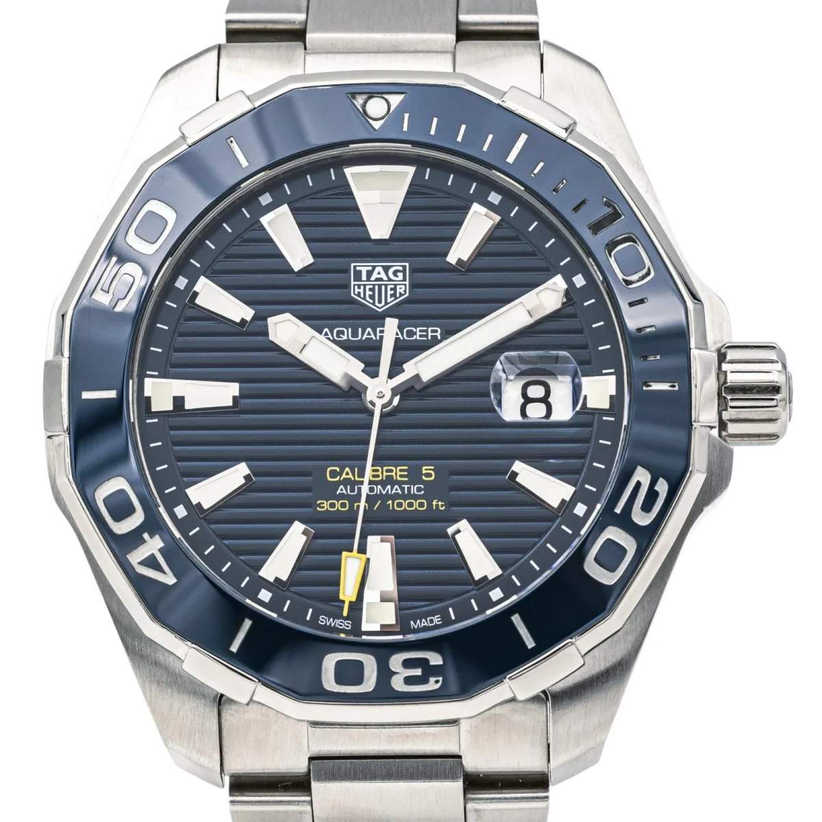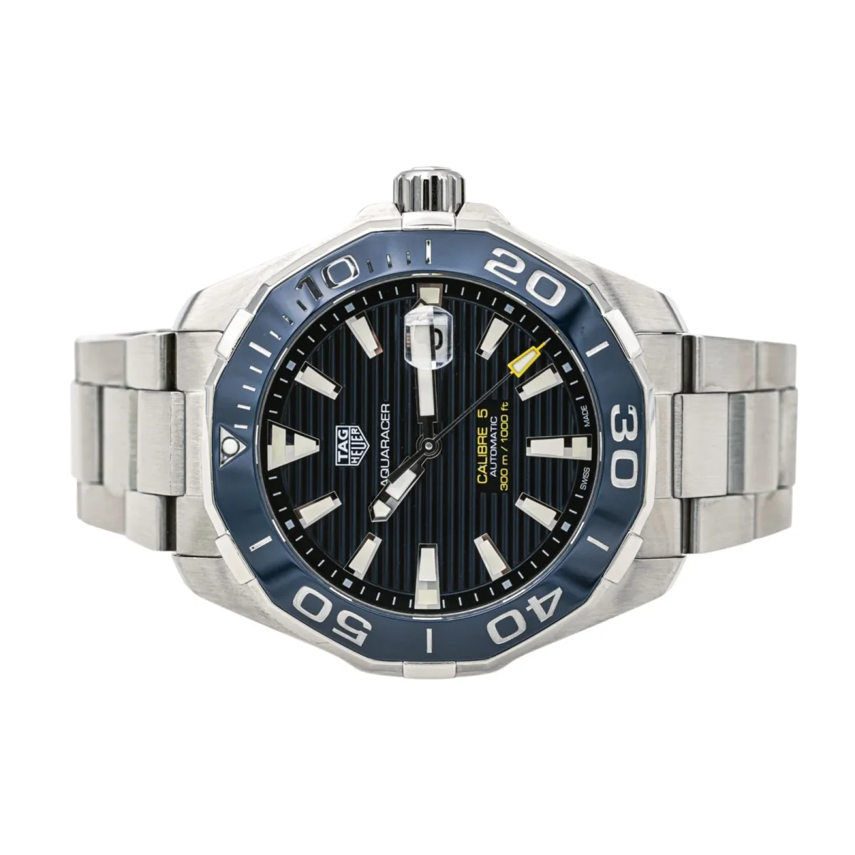 Montre Tag Heuer modèle « Aquaracer » calibre 5 acier, réf WAY201B-0, n°série RQL7636 , cadran bleu à index bâton, mouvement mécanique à remontage , boîtier 43 mm, verre saphir, bracelet acier à boucle déployante (taille poignet 23,00 cm, largeur bracelet 1,80 cm), poids total : 191,74 g, boite d’origine et un maillon supplémentaire, année 04/2019, révision complète et garantie 1 an, excellent état