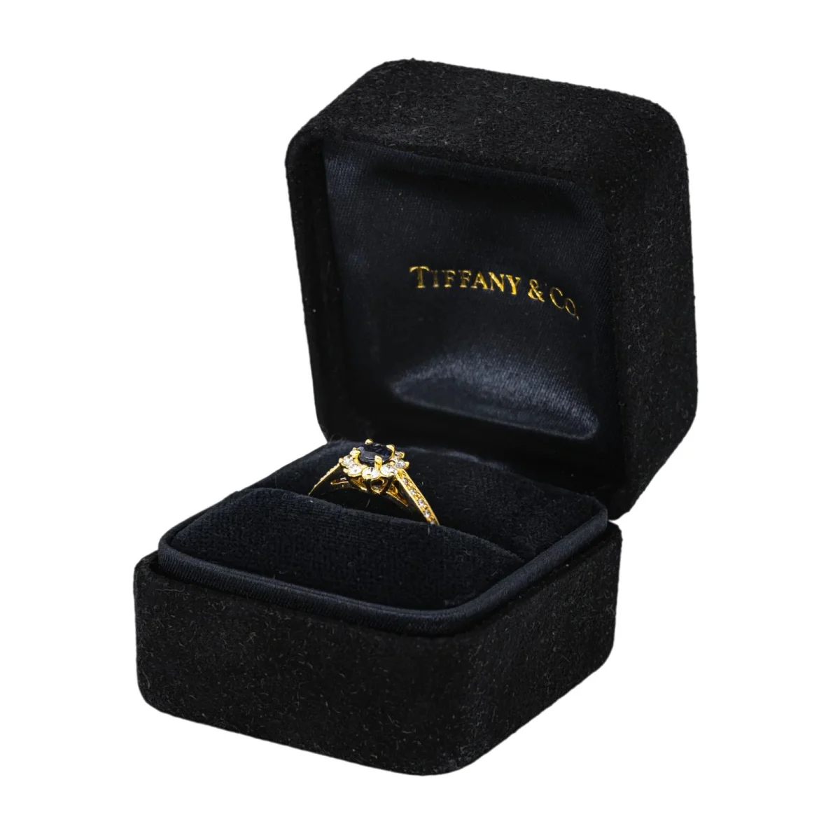 Bague signée de la Maison Tiffany&Co en or jaune 750 millièmes (18 carats), sertie de saphir et de diamants, 1 saphir taille rond, d’un poids total d’environ 0,30 ct, entouré de 20 diamants taille brillant, environ G-VS, d’un poids total d’environ 0,37 ct, (chaque diamant d’un poids d’environ 0,18 ct), largeur sur le dessus : 0,79 cm, tour de doigt : 51, poids total : 3,32 g, poinçon tête d’aigle, vendue avec écrin d’origine et d’époque, excellent état