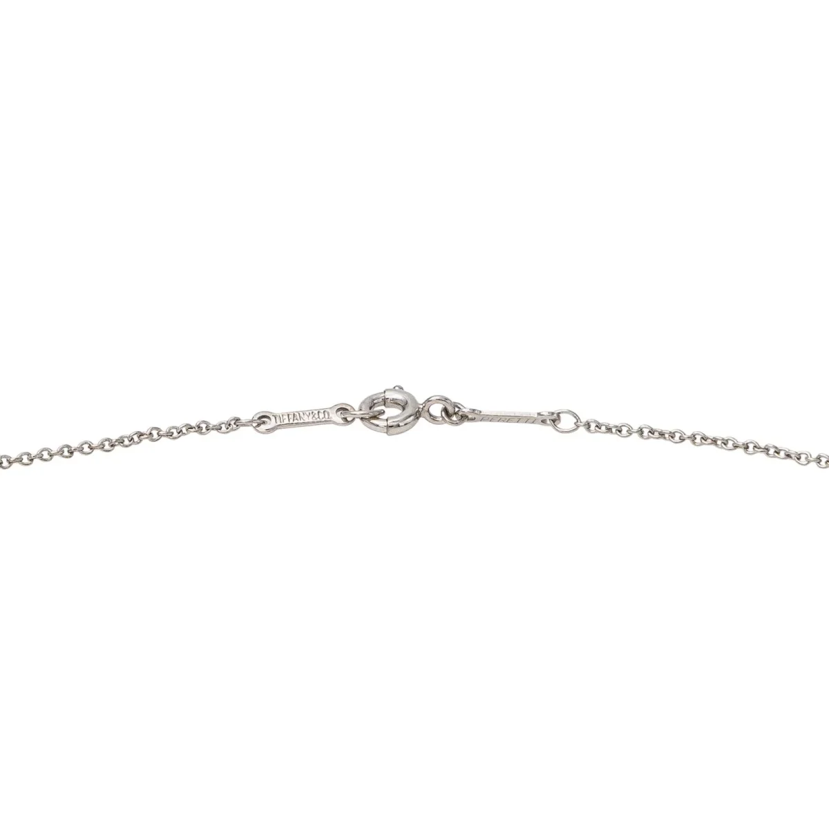 Collier signé de la Maison Tiffany en or blanc 750 millièmes (18 carats) testé, modèle Open Heart, motif coeur serti de 7 diamants, environ G-VS, taille brillant, poids total diamants : environ 0,03 ct (chaque diamant d’un poids d’environ 0,005 ct environ), maille forçat, longueur : 40 cm, longueur de la partie comprenant les motifs : 0,16 cm, poids total : 5,27 g, excellent état