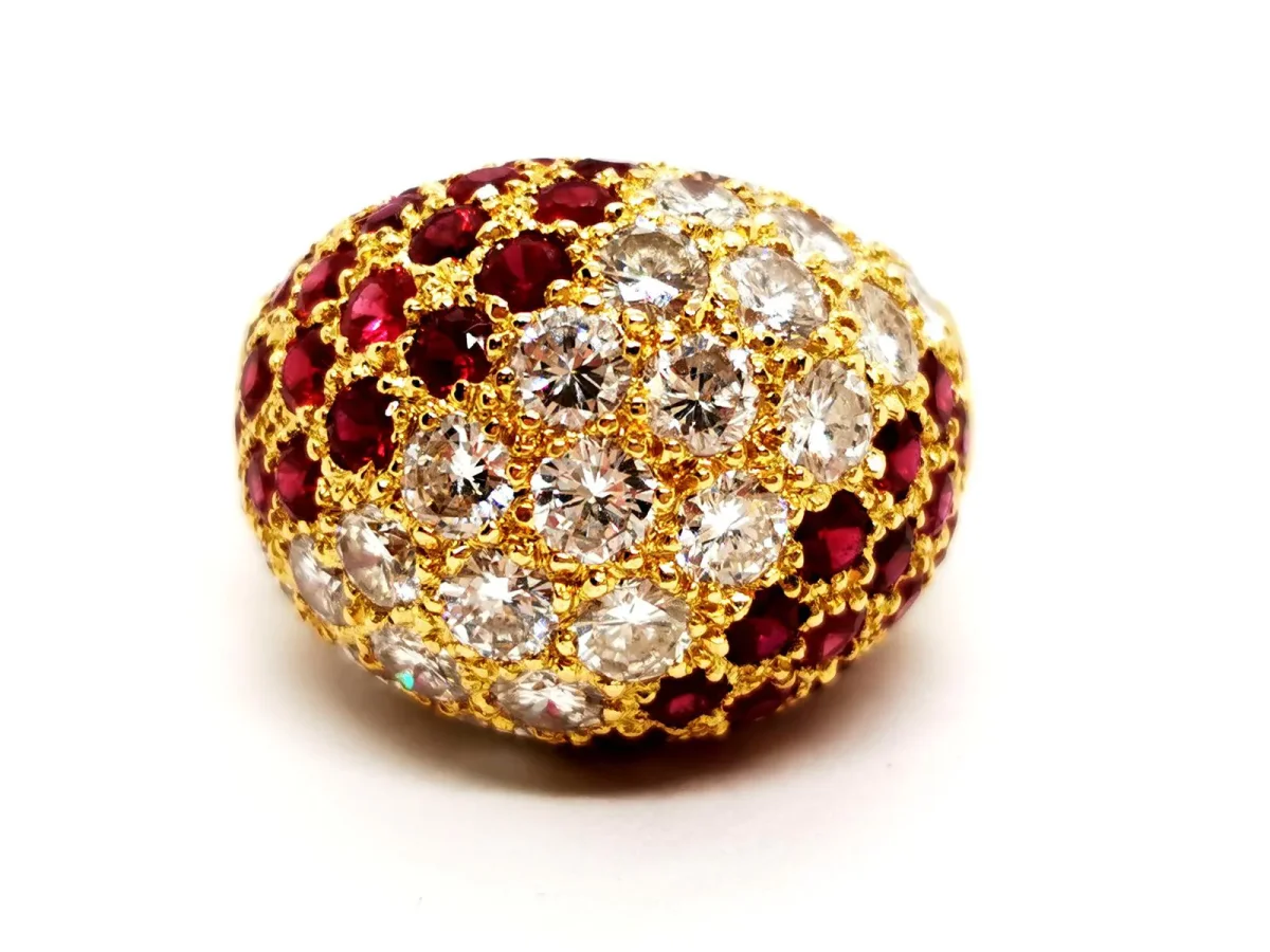 Bague signée de la maison Van cleef & Arpels, en or jaune 750 millièmes (18 carats), modèle boule, vintage rare, pavée de 32 diamants taille brillant F-G/VS, dont 26 diamants d’environ 0,11 ct chacun, 2 diamants d’environ 0,02 ct chacun, 4 diamants d’environ 0,01 ct chacun, poids total diamants: environ 2,94 carats, pavée de 50 rubis brillant, dont 40 rubis d’environ 0,04 ct chacun, et 10 rubis d’environ 0,015 ct chacun, poids total rubis: environ 1,75 ct, tour de doigt: 56, largeur sur le dessus: 1,65 cm, hauteur: 1,17 cm, poids total: 13,12 g, signature Van Cleef & Arpels (partiellement masquée par une barre d’ajustement de taille), numérotée: 780090-91597, poinçon tête d’aigle, excellent état
