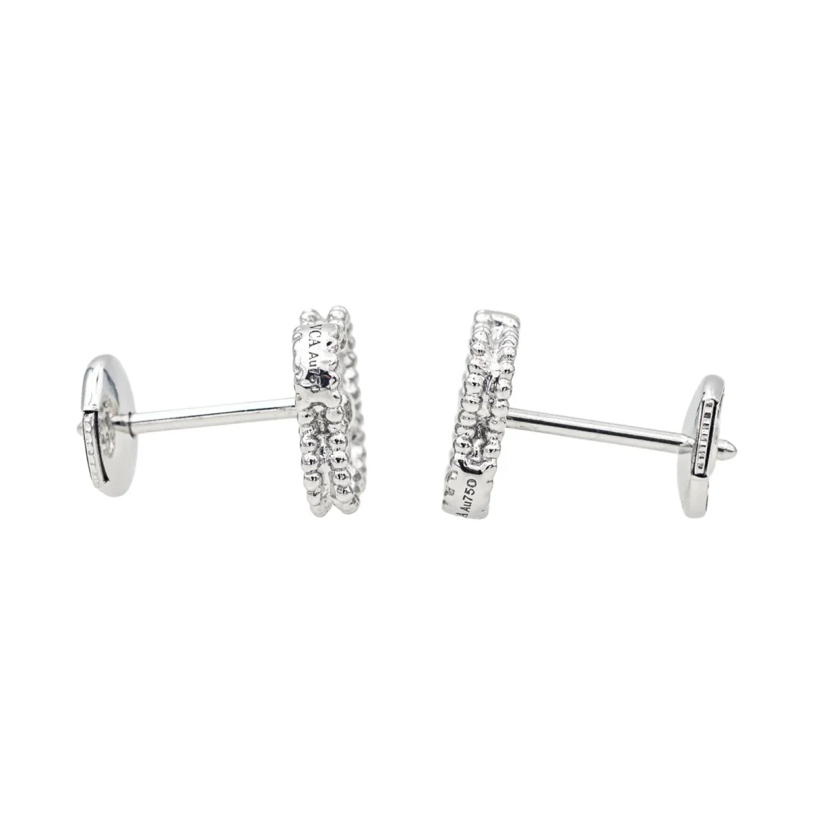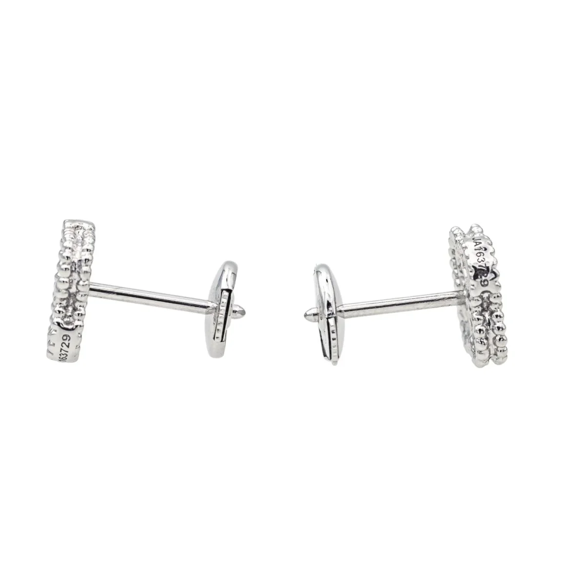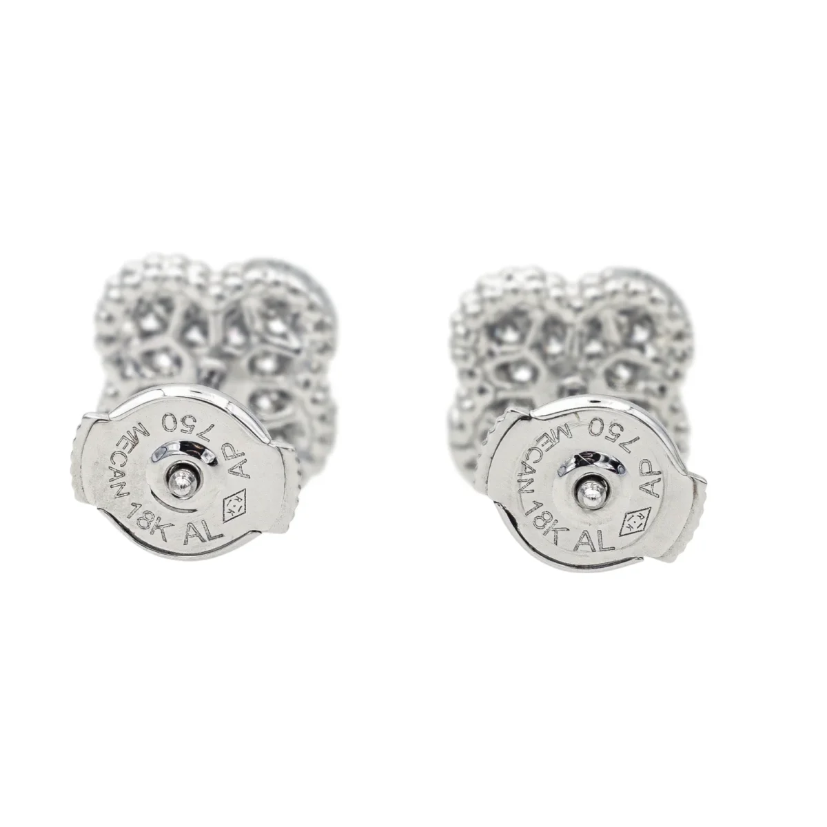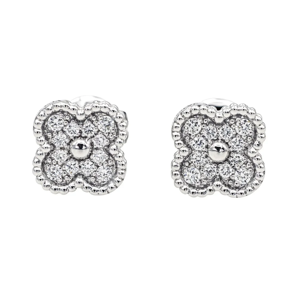 Boucles d’oreilles puces signées de la Maison Van Cleef et Arpels en or blanc 750 millièmes (18 carats) testé, modèle Sweet Alhambra, serties de 24 diamants taille brillant, poids total de diamants environ : 0,16 ct, (chaque diamant d’un poids d’environ 0,006 ct), dimensions : 0,93 cm x 0,80 cm, poids total : 2,28 g, vendues avec écrin d’origine et d’époque, numérotées : JA163729, excellent état