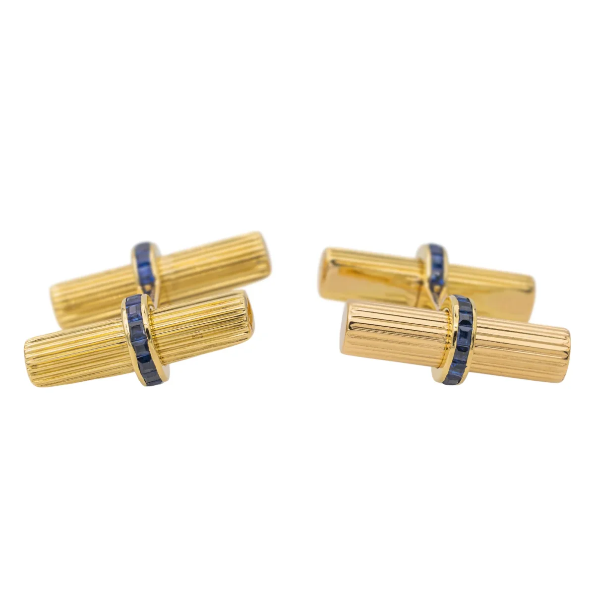 Boutons de manchette, signés de la maison Van Cleef et Arpeels et Jacques Lacloche, en or jaune 750 millièmes (18 carats), sertis de saphirs, taille carré, d’un poids total d’environ 1,56 cts, (chaque saphir d’un poids d’environ 0,03 ct), dimensions: 2,52 cm x 2,20 cm, poids total: 12,64 g, poinçon tête d’aigle, poinçon de maître […]