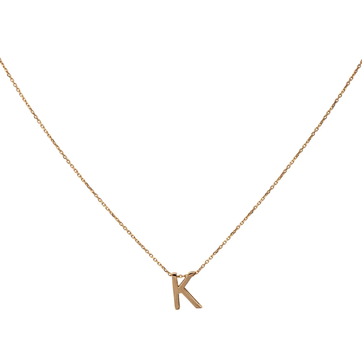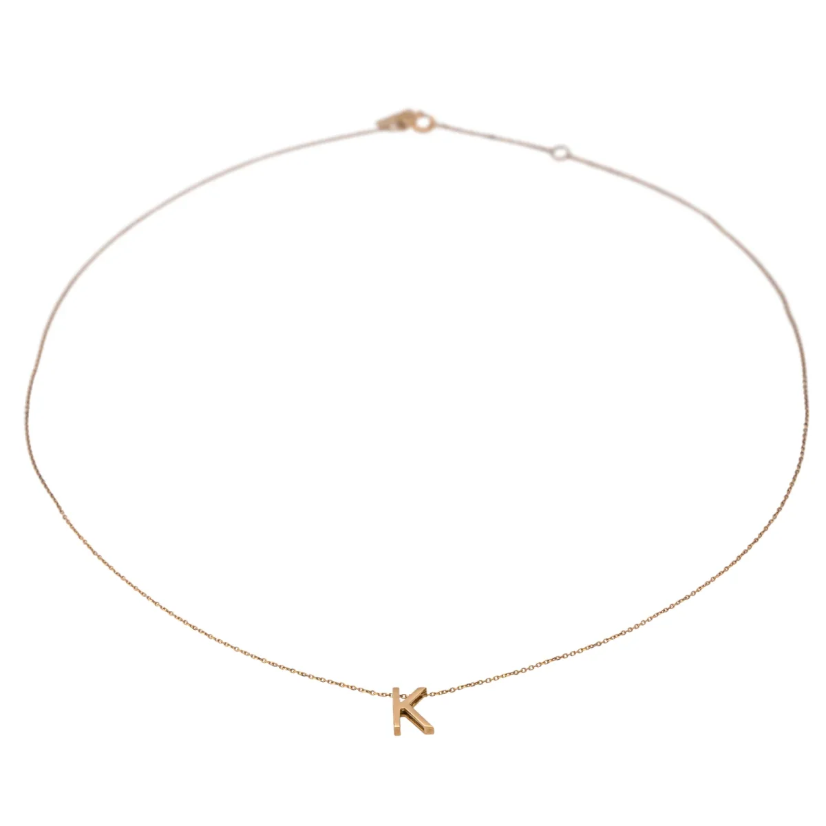 Collier signé de la Maison Vanricke, en or rose 750 millièmes (18 carats) testé, collection abécedaire, lettre K, longueur 42 cm avec anneau intérmédiaire à 40 cm, lettre 0,8 cm x 0,5 cm, poids total 1,18 g, prix neuf: 760 €, excellent état