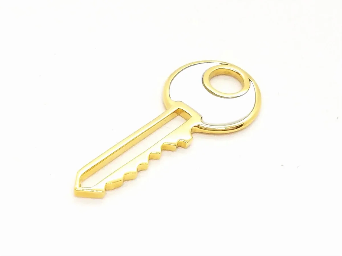 Pendentif clé signé de la maison Victoria Casal en Or jaune 750 millièmes (18 carats) testé, Collection « Clé du Bonheur », Intérieur de la clé en nacre blanche, hauteur: 3,24 cm, diamètre du rond: 1,38 cm, épaisseur: 0,14 cm, Poids total: 2,18 g, Signature sur la tranche de la clé, Excellent état