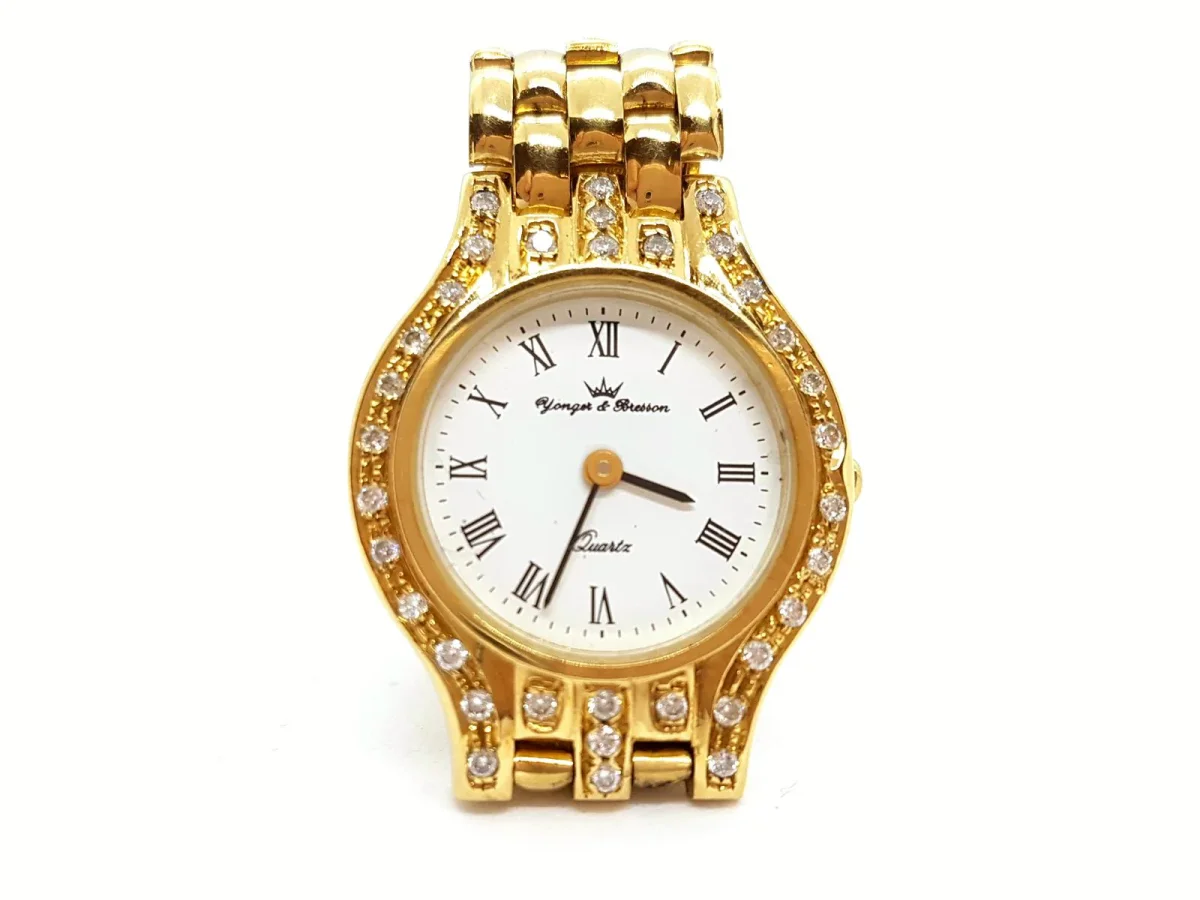 Montre femme signée de la maison Yonger & Bresson, en Or jaune 750 millièmes (18 carats) et sertie de 34 diamants taille brillant, G-H, SI pour un total d’environ 0,34 carat, taille du boîtier: 23 mm, Taille du bracelet: 17,5 cm, bracelet maille grain de riz en or 750 millièmes (18 carats), cadran blanc chiffres romains, Mouvement quartz, largeur du bracelet entre 1,2 cm (coté cadran) et 0,8 cm (coté fermoir), poids total: 33,13 g, poinçonné, Excellent état