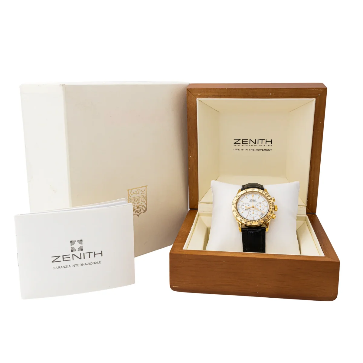 Montre Zenith modèle El primero or jaune, n°série 06-0053-400, cadran blanc à index, mouvement automatique, boitier 40mm, verre saphir, bracelet cuir boucle ardillon (Taille poignet 22cm ajustable, Largeur bracelet 1,8cm) poids total 77,84g, full set (boite et papier d’origine), année 2003, Excellent état