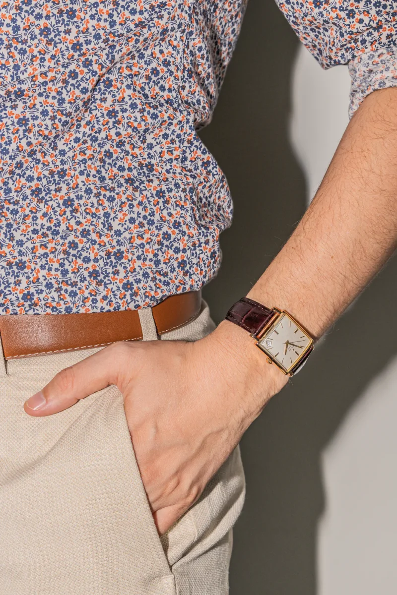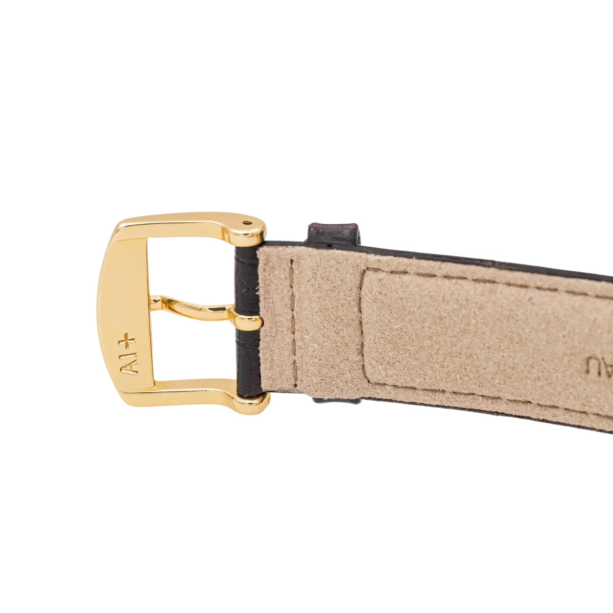 Montre Zénith modèle Square or rose 750 millièmes (18 carats), n°série 149692, cadran blanc à index bâton, mouvement mécanique à remontage automatique, boîtier 29 mm, verre plexiglass, bracelet cuir boucle ardillon (taille poignet 19 cm ajustable, largeur bracelet 1,9 cm), poids total : 40,12 g, années 70/80, poinçon tête d’aigle, excellent état